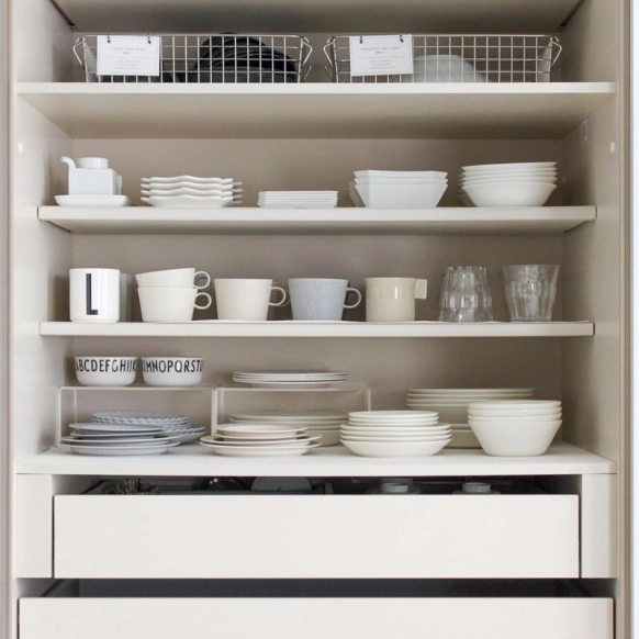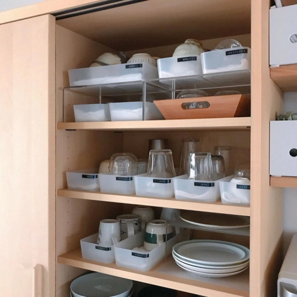 食器棚の収納方法は、棚板で仕切りができて一見簡単そうですが、実は食器のサイズに合っていなかったり、奥の食器が取りにくかったり、無駄なスペースができたりと、不便な点もあるんです。棚の数を調整できるなら、食器に合わせて棚を増やすなどの対応をしてみましょう。また奥の食器が取り出しにくい場合は、ケースやかごを使って収納すれば、奥の食器を簡単に取り出せますよ。