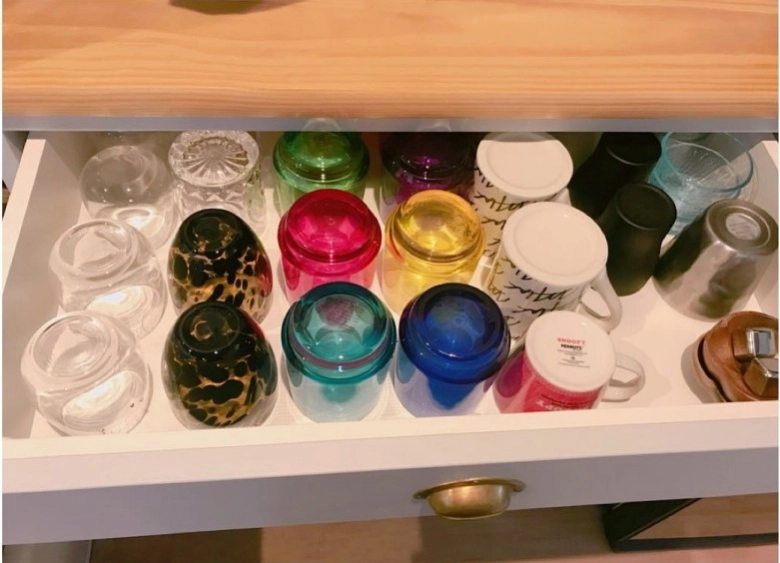 高さのない引き出しの食器収納は、重ねない収納で取り出しやすく!コップなどの飲み口が直に下につくのが嫌な方は、抗菌や防虫の食器棚用シートを敷いておくと安心です。また、シートを滑り止めのものにすると、引き出しの開け閉めの衝撃でコップがズレることも防止できます。