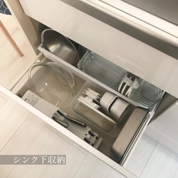 シンク下に容量の大きい収納がある人は、ぜひ食器収納に活用しましょう。食器だけでなく使用頻度が高い調理器具などを収納すれば、使い勝手の良いキッチンになりますよ。シンク下の収納は、真上から見て取る機会が多いので、無印のブックラックや100均のプラケースなどを使って、立てて収納すると取り出しやすく動きもスムーズです。