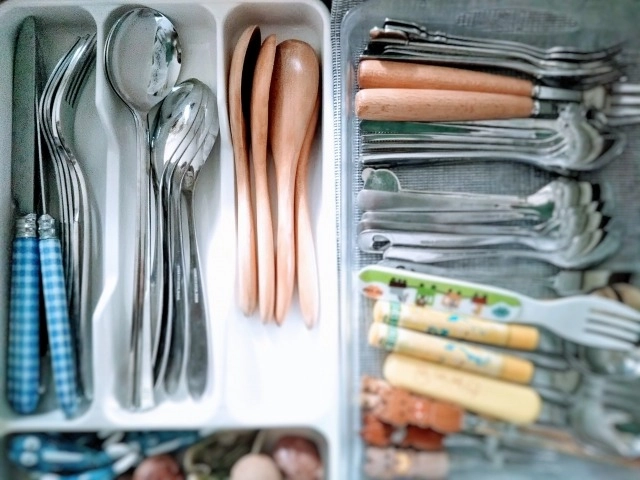 サイズや素材など種類が豊富でごちゃごちゃしがちなカトラリー類は、間仕切りなどを使ってすっきりさせることで、使うときに探す手間が省けます。子どもが自分で出すときも、使いたいスプーンなどが簡単に見つけられて便利ですよ。間仕切りは100均や『無印良品』、ホームセンターにも数多く取り扱っているので、しっかり採寸して合うものを探してみて。