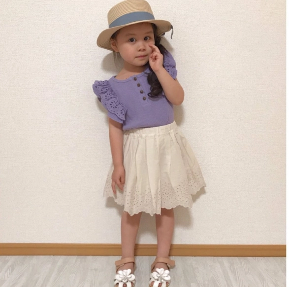 肩のフリルがとってもかわいいテレコTに、裾レースのひざ丈ふんわりスカートが、キュートなコーデ。くすみパープルにベージュの組み合わせが、少し背伸びをした感じで素敵です。