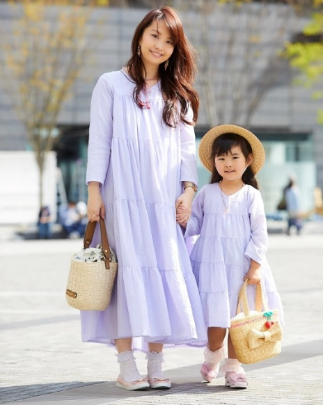 実はママ向けブランド『petit main LIEN(プティマイン リアン)』が、プティマインでは展開されているんです。ラブリーなティアードワンピースも親子そろっちゃいますよ♡かごバッグが春夏らしく、ラベンダー色のワンピースにマッチ。