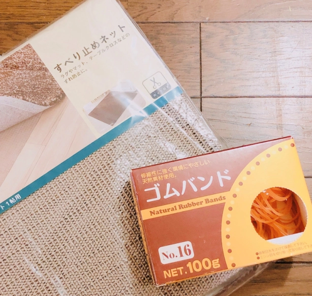 1.滑り止めシートを適当な長さにカットし、椅子の脚にぐるっと巻きつけます。2.巻きつけた滑り止めシートを輪ゴムで留めます。3.後は上から椅子脚カバーをかぶせるだけ☆滑り止めシートの効果で、カバーが脱げにくくなります。