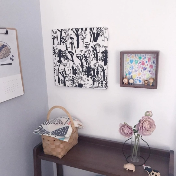 写真左のファブリックパネルは、北欧ヘルシンキのテキスタイルブランド『Kauniste(カウニステ)』のファブリックを使った@k_ei_ie_kさんのハンドメイド作品です。カウニステは2008年にヘルシンキで誕生した北欧発信のテキスタイルブランドで、ファブリックも人気のブランド。パネルにすることで、気に入ったデザインを思いっきり眺めて楽しむことができますね。