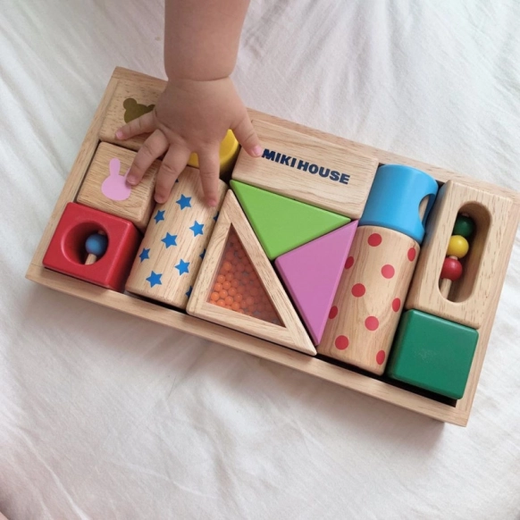 力加減や指の使い方を学べる積み木は、想像力や器用さをアップさせられるアイテムです。振ると音がするラトルブロックは、積み木を上手に積めない頃でも、転がしたり振ったりして遊べるのがいいところ。ミキハウスの積み木は、星柄やドット柄などデザインがキュートなので飾っておくだけでも素敵です。箱入りなので、出産祝いとして贈ってもいいですね!