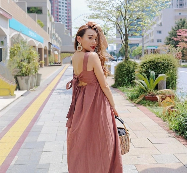 このワンピースは背中が大きく開いたデザインになっているので、1枚で着こなすとセクシーさも出るんです。下ろしたロングヘアから背中がちらっと見えるのが、さりげなくて素敵♡さらに大ぶりのピアスがアクセントになっていますね。やっぱりバッグは、カゴバッグがこれからの季節にぴったり。