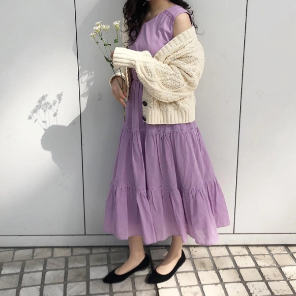 こちらはティアードワンピの上に、ショート丈のニットアウターを組み合わせたコーデ。ティアードワンピという名前は、層や段を意味する英語からきています。女性らしいアイテムを足し算することで、とてもかわいく仕上がっていますね。ニットアウターをあえてズラして着るのも、上級者のテク!こなれ感が出て、おしゃれに見えます。