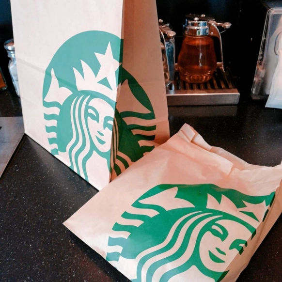 スタバでは、ドリンクだけでなくフードメニューのテイクアウト(持ち帰り)が可能です。商品に応じて、画像のような紙袋やボックスに入れた上で、ショッパーに入れてくれますよ。