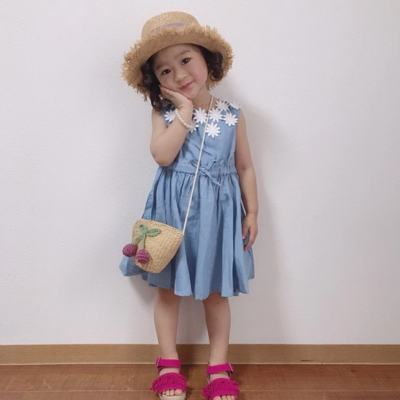 先ほど紹介したリボンつきラフィアハットにお花モチーフジャンパースカートを合わせた夏らしさ抜群のスタイル。チェリーのバッグとフリルサンダルのピンクがよく似合う、オールプティマインなコーデです。女の子らしさ満点のキュートな着こなしはまるでモデルさんですね♡