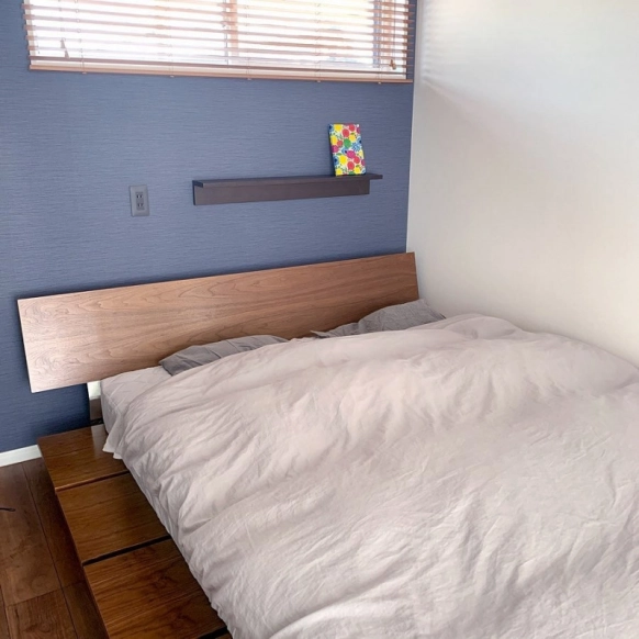 ローベッドなら、「寝室が狭い」というお悩みを即解決!ロータイプの家具をそろえれば、圧迫感を感じず広い空間に見えます。ネイビーのアクセントクロスが、さわやかで清潔感ある印象のインテリアです。ベッドと同じ色みのウッドブラインドが、ナチュラルで素敵ですね。