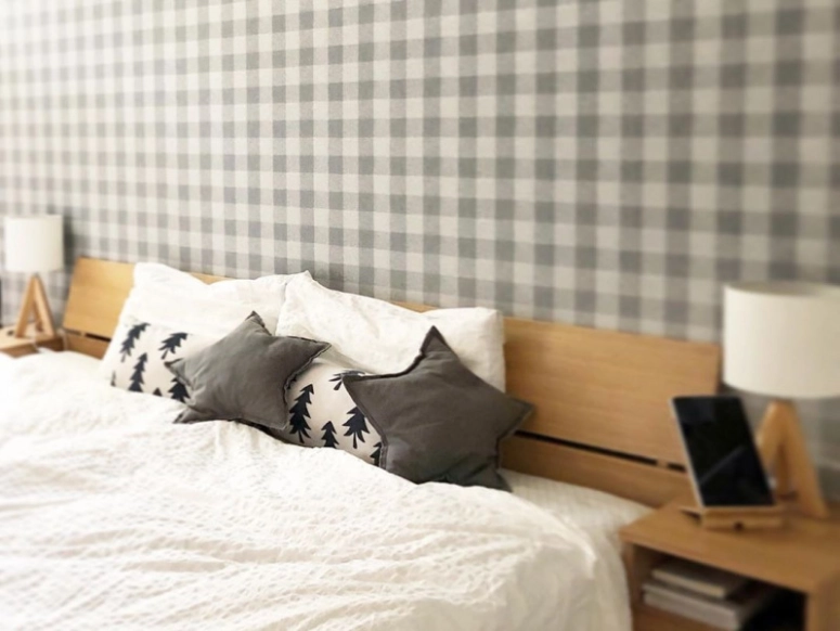 ギンガムチェックのクロスがとってもキュートな印象です。森の柄のクッションが北欧テイストらしさバツグン!星型クッションとともに、無地のファブリック類のアクセントになっています。モノトーンのなかにもかわいらしさがあるお部屋です♡