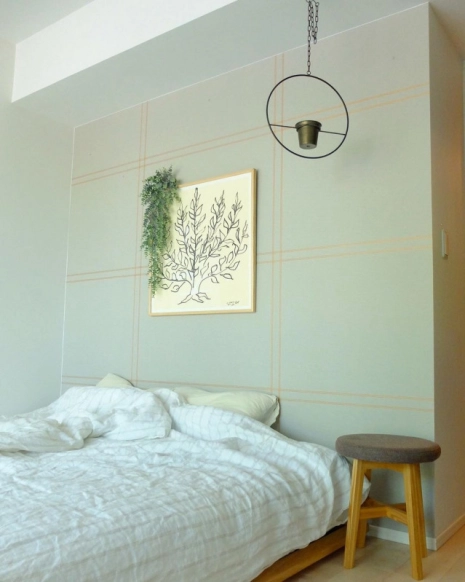 淡いパステルグリーンのアクセントクロスが、部屋全体をやわらかく上品な印象に見せてくれますね。さわやかなインテリアの寝室で、朝の目覚めもすっきりでしょう。明るい木目のベッドやサイドテーブルが、ナチュラルな北欧テイストにぴったり☆