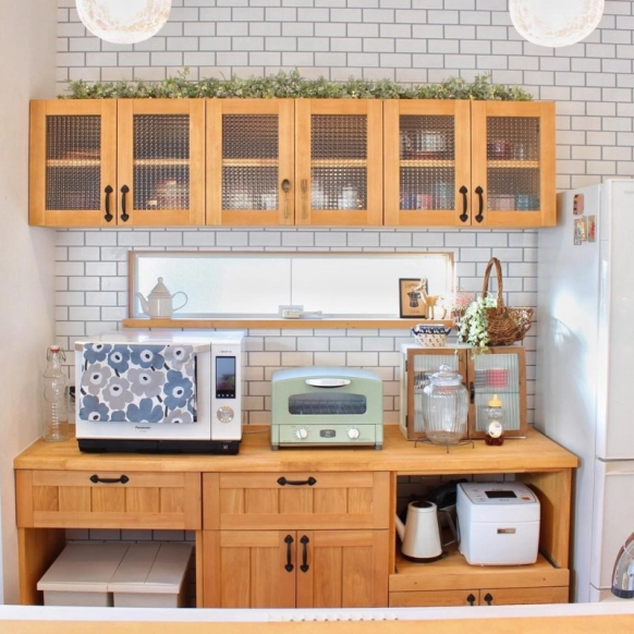 @___n.houseさんのキッチンでひときわ目を引く木製のカップボードは、オーダーで作ったオリジナルとのこと。ナチュラルな小物やレンジにかけたマリメッコのファブリックが印象的ですね。