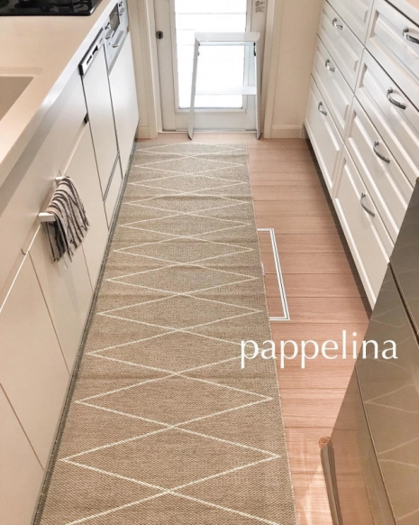 油や水が飛びやすいキッチンの床はマットがある方が掃除も楽です。@maya__homeさんのキッチンに敷かれているのは、お手入れが簡単と話題の北欧ブランド『Pappelina(パペリナ)』のキッチンマット。スウェーデン製のパベリナのマットは、ビニール素材の繊維を編んで作っているため少しの汚れはさっと拭き取りで対応できます。リバーシブルになって両面が使えるのも人気の理由です。