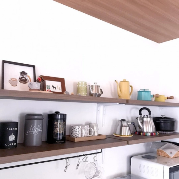 北欧のキッチン雑貨は鮮やかなカラーやかわいらしいフォルムのものも多く、棚に飾るだけで立派なインテリアになります。ベースを白やナチュラルな木製に統一するなら、アクセントとして華やかなカラーを取り入れるのが美しく見えるコツ。飾り棚を取りつけたりカップボードに並べるなど、お気に入りのキッチン雑貨で見せる収納にチャレンジしてみましょう。