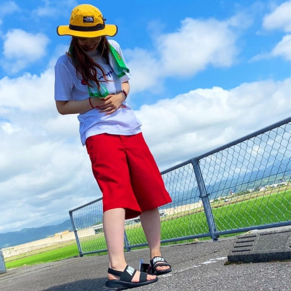 鮮やかなレッドのハーフパンツがインパクトあり!大胆な色使いでライブに参戦すれば、気分も一層上がりそうです☆
