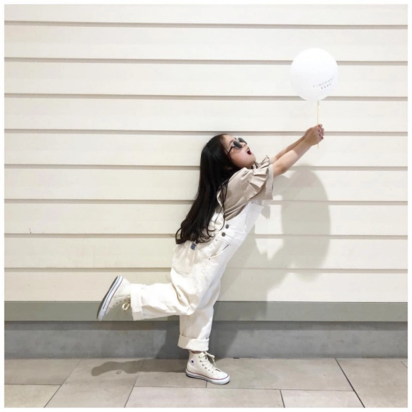 白のオーバーオールに、グレーのインナー、ベージュのキャップを合わせたシンプルな色遣い。ストリート系ながら、どこか洗練された雰囲気も感じられる大人っぽいキッズコーデです☆クールな着こなしにキュンとしちゃいます!