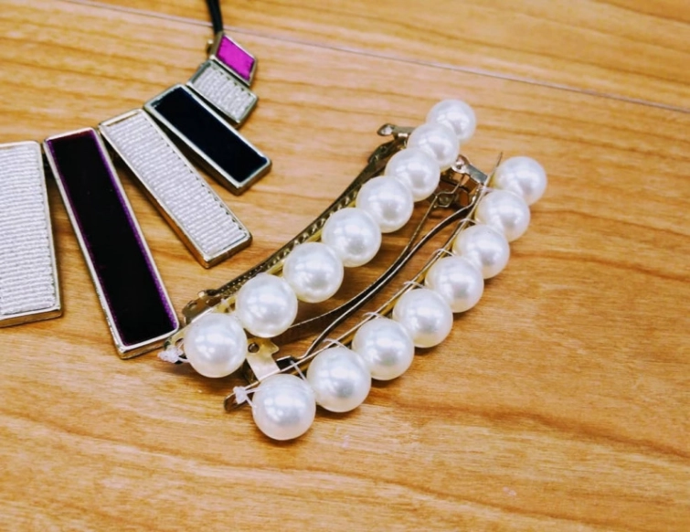 パールを釣り糸などの透明な糸で通してバレッタに巻きつけながら固定していくと、素敵なパールバレッタができます!上の写真は白のパールを使用していますが、白と灰色のパールを交互にする方法やコットンパールを使っても、とても上品なヘアアクセになりますよ。