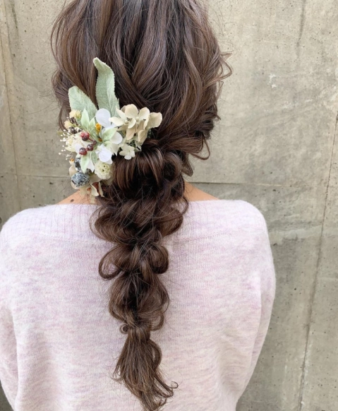 最近ではお花を使ったヘアアレンジが増えてきているようです。自分でハンドメイドしても◎編み込みをした耳後ろにつけると、写真を撮るときなどチラッと上品に見える花のヘアアクセが華やかにみせてくれること間違いなしです!