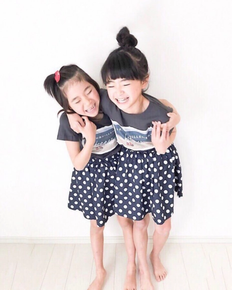 HusHusHのプリントTシャツ×ドット柄スカートを合わせた、姉妹のリンクコーデ。シックなカラーで統一しているので、リンクコーデでも大人っぽく着こなせますね。フェミニンなドット柄のスカートは、ユニセックスなTシャツと合わせるとおしゃれにカジュアルダウンできます。