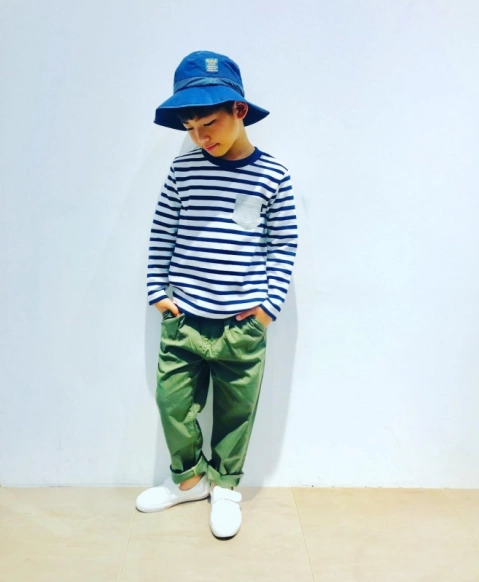 こちらは、HusHusHのボーダーロングTシャツ×カーゴパンツのコーデ。シンプルでかっこいい、大人顔負けのカジュアルコーデですね。帽子、トップス、パンツで色味を出し、足元はクリーンなホワイトで抜け感を演出。カーゴパンツをロールアップすることで、スタイルよく着こなせます。