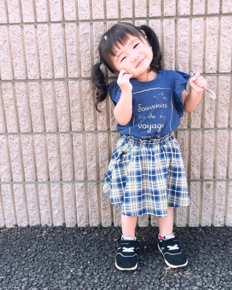 HusHusHのフリル袖トップス×チェックのスカートを合わせたコーデです。トップスとスカートの色味を合わせれば、リンクしやすいので◎ですよ。足元はスニーカーをオンして、カジュアルダウン。動きやすいので、公園コーデやワンマイルコーデにピッタリです。