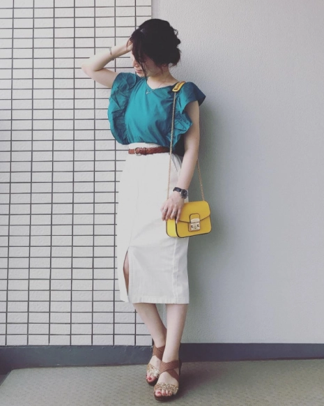 やっぱりノースリーブは…という人には、フリルタイプのノースリーブがおすすめ。気になる二の腕を隠しつつ、女性らしさも演出できますよ。白のデニムタイトスカートは、春から夏にぴったりのアイテム。ホワイトトーンコーデもいいですが、写真のように鮮やかなカラーのトップスと合わせると、上品な着こなしに。