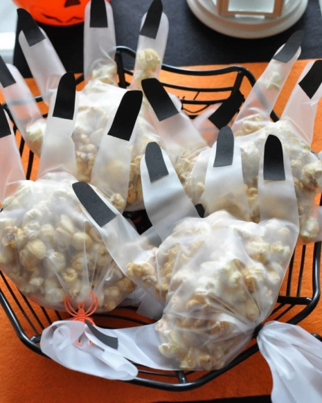 @suzuki_sayoriさんの作ったハロウィーンラッピング。これはアイデア賞ものですね。普通のビニール手袋にお菓子を詰めて黒い折り紙で爪を再現。今までありそうでなかったアイデアでしょう。子どもウケがとてもよさそうなラッピングです。