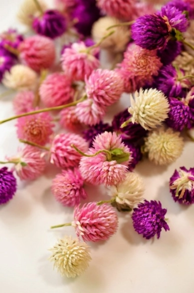 ころんとした千日紅はかわいさ抜群♡ピンクベースのいろいろなカラーがあるので、複数の色味を使ってカラフルな髪飾りにするのもいいですね。どのドライフラワーとの組み合わせも◎のかすみ草との合わせなら、かわいい髪飾りになりますよ。