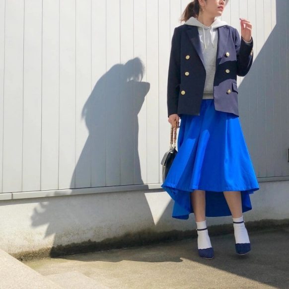 @ sao_87wdさんは、ラベンダーカラーのスカートが目を引く爽やかなコーディネートをしています。ネイビーのジャケットを羽織ることで、引き締まったコーディネートに。肌寒い日がまだある春には、ジャケットがあると重宝しますよ。