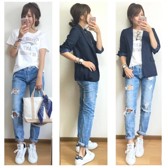 キレイめコーデに大活躍のジャケットは、ザ☆カジュアルなコーデにもいけちゃいます。@ miyopuさんは、定番ネイビージャケットにダメージデニム、スニーカーを合わせています。シンプルなTシャツスタイルにオンするだけで、こなれ感が出せますよ。