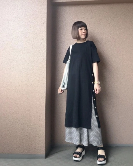 ボタンTワンピースと小紋柄のプリントロングスカートがバランス抜群な@ aki_rhythm_blackさん。フレアスカートのレイヤードが、楽ちんでおしゃれ見えが叶うイチオシコーデなのだとか。ブラックをチョイスすると、着痩せ効果あり!足の甲が見えるサンダルを合わせることで、足元に抜け感がプラスされて重く見えません。