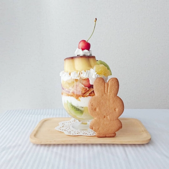 @inoko_oinkさんのおうちパフェは、ミッフィーのサブレを添えたプリンアラモード風。さくらんぼ、キウイ、日向夏などの季節のフルーツに砕いたパイとヨーグルトを加え、「プッチンプリン」を大胆にトッピング。クリームではなく水切りヨーグルトを使うことで朝食にもなるヘルシーなパフェに仕上がっています。かわいい花型のプリンと明るいカラーのフルーツがミッフィーの世界観にピッタリですね♡