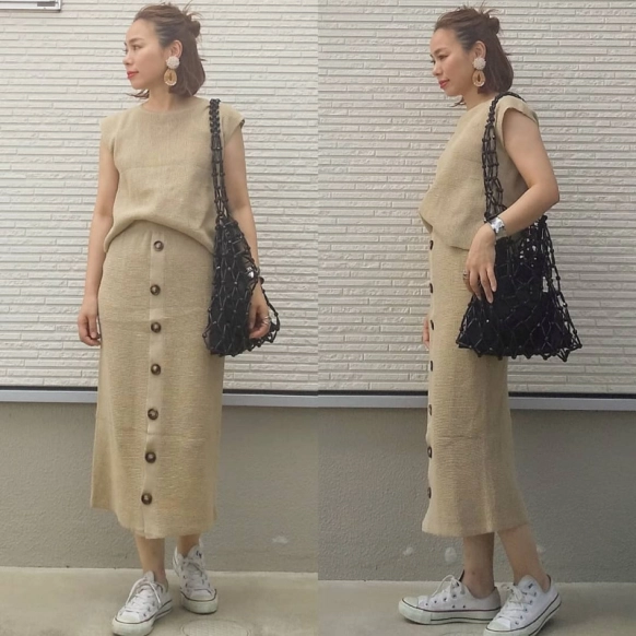 2019年の夏に人気を集めたのが、『fifth(フィフス)』の「フロントボタンサマーニットアップ」。ボタンデザインがポイントのタイトなニットセットアップは、簡単に夏らしくトレンド感のあるコーデを叶えてくれます。キャップやスニーカーを合わせて、メンズライクに仕上げるのもおすすめです。