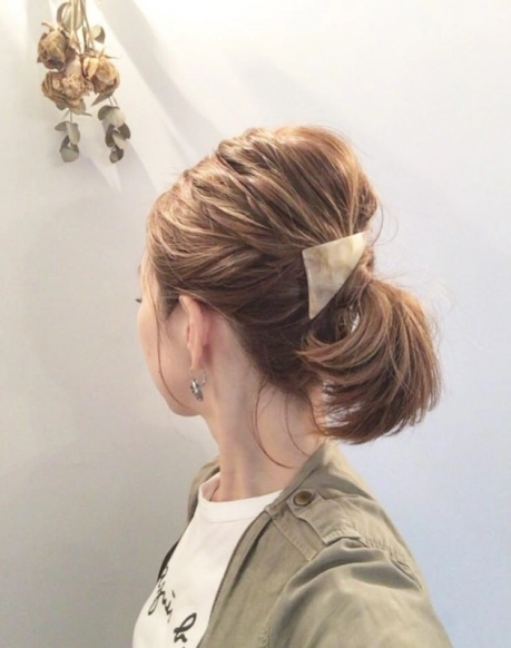 こちらは低めの位置でひとつ結びをしたあとに、毛先をくるっとまとめてゆるくシニヨンに。結び目から少し横にズラしてバレッタを添えるのが、こなれ感を演出するコツです。