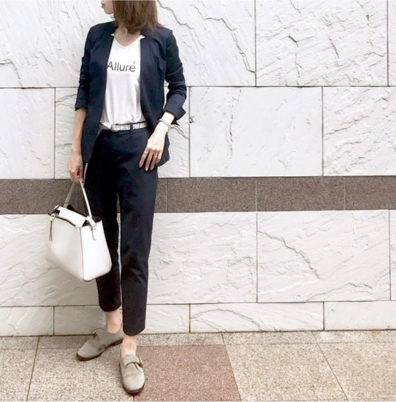 スーツを着るとき、シャツやブラウスを合わせることが多いですよね。しかし、近年では夏の”クールビズ運動”の影響もあり、スーツとカットソーを合わせてコーデを楽しむ方が増えているんです。ラフなイメージのあるカットソーですが、ジャケットを羽織るだけでカチっと感がプラス。ジャケットとボトムスを合わせるのがポイントです。