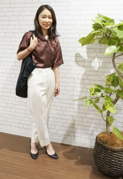 「オフィスカジュアルがOKなので、内勤のときはジーンズとスニーカーで出勤可能。社外の方と会う時はカッチリした洋服で、内勤の時はリラックスした洋服でメリハリをつけています。この日はユナイテッドアローズのシャツ、ZARAのパンツ、TOMORROWLANDのパンプスです。ポーターの大きいバッグは子どもたちの用意も入れられるサイズなので気に入っています!」