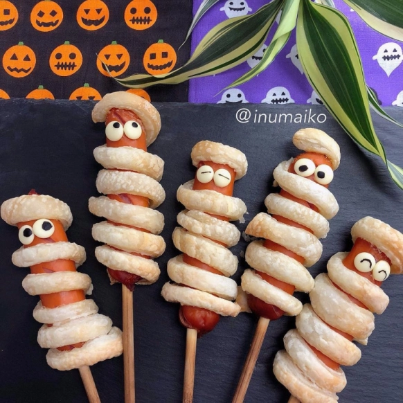 棒つきのフランクフルトに、細くカットしたパイ生地をクルクル巻きつけて焼けば完成。渦巻くようなかわいい見た目のフランクパイが作れます。棒つきなので手を汚さずに食べられるのもうれしいですね。