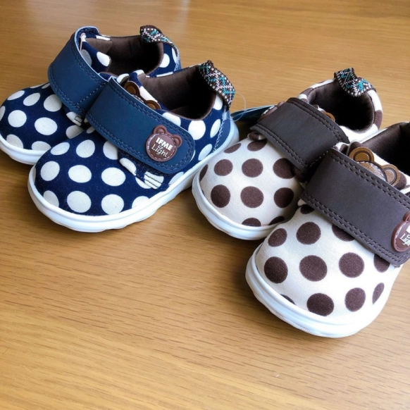 型番22-6707のこちらは、ドットの模様とシックな色味がオシャレ!男の子でも女の子でも使いやすいデザインなので、きょうだいでそろえてみてもかわいらしいですね。シュータン部分にもくまのモチーフがデザインされており、はくときも脱ぐときも楽しくなっちゃいそうです。