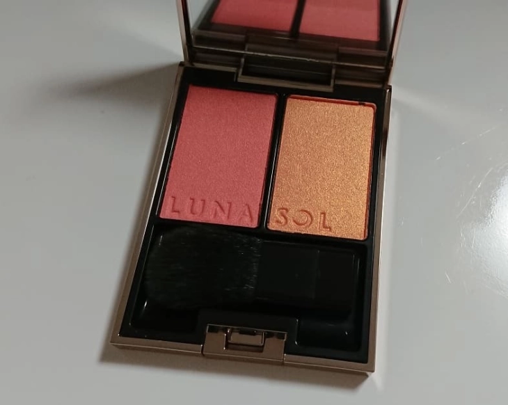 全部で3色展開!血色感と立体感のある頬を演出してくれるルナソルの新作チークです。今回紹介するお色は02 Sunset Glow(サンセットグロウ)です。基本的な使い方は、左側のチークを頬にのせ、右側のチークをその上からのせるとツヤ感がでます。