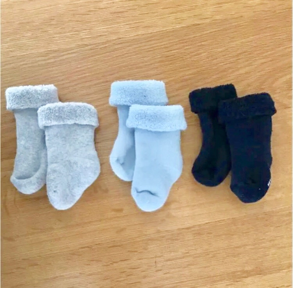 赤ちゃんの靴下はとにかく小さくてかわいいですよね。写真の靴下は3足セットで出産祝いにもおすすめです。