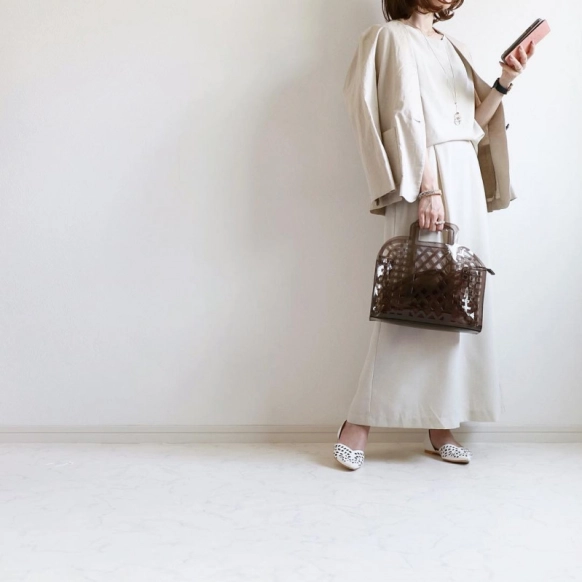 薄手のリネンのノーカラージャケットに、トレンドのティアードスカートをあわせた軽やかなコーデに仕上がっています。ベージュ×ホワイトのワントーンコーデに麦わら帽子をプラスすることで、ジャケットを着てても夏らしい涼しいコーデを実現させています。