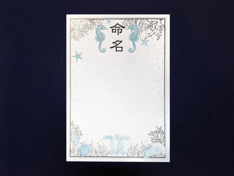 @march_okinawaさんの沖縄のお店では命名書を購入したらオプションで名前を印刷してくれます♡柄はタツノオトシゴだけでなく、馬や鳥など種類がたくさんあり人気で、@march_okinawaさんの「Instagram(インスタグラム)」の画像から通販ページに飛ぶことができますよ!自分で印刷もできますが、お店にオーダーするときれいに印刷で代筆して即日発送してくれるのでおすすめです。