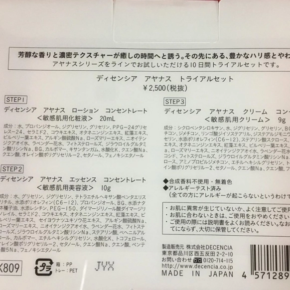 ヒト型セラミドを浸透しやすいナノサイズカプセルにして、乱れて過敏になった肌を健やかな状態へと導きます。配合されている高浸透グリセリンが、肌から分泌される皮脂と一体化。ナチュラルなみずみずしい肌を演出します。<アヤナス エッセンス コンセントレート>黄ぐすみの原因になるAGEsに着目して発生を抑制。また、オーガニックリフトオイルが高保湿とハリを実現します。敏感肌の一因ストレスを軽減させるディセンシアのオリジナル成分”ストレスバリアコンプレックス”を配合しています。<アヤナス アイクリーム コンセントレート>敏感肌は炎症や角質層の乱れからシワとくすみにより”影じわ”が発生することに着目。潤いに満ちた健康的な目元に導くコンドロイチンが配合されています。また、リフトアップ、抗ストレス、エイジングケアにも対応しています。