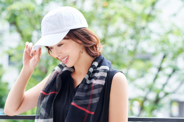 カジュアルなファッションに合わせて、メイクはベージュ系で。目元はベージュのアイシャドウを自然に重ねています。口紅もナチュラル系のベージュを選択。そして、おすすめなのがベージュ系のチークを使うこと。なじみやすく、塗ると発色よくてかわいいので、ベージュのチークは便利な存在です。キャップは、時間がないママたちにとってヘアスタイルが決まらないときにも、おしゃれに見えるお助けアイテム。ただし、スポーティになりすぎないように注意を。井上さんのようなレイヤードなら、毛先にワックスを揉み込むようにして、ニュアンスをつけて。ボブだったら、毛先だけアイロンで巻くとGood!