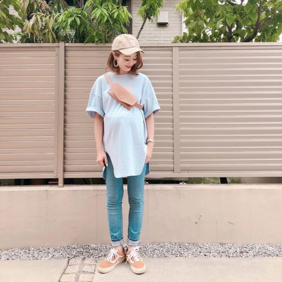 ユニクロのデニムパンツはどんな服にも合わせやすいので重宝するアイテムのひとつ。ユニクロではマタニティー商品が豊富にそろっていて、デニム生地だけでなく、白や黒などの色展開も充実しているので、マタニティ―コーデには欠かせません。