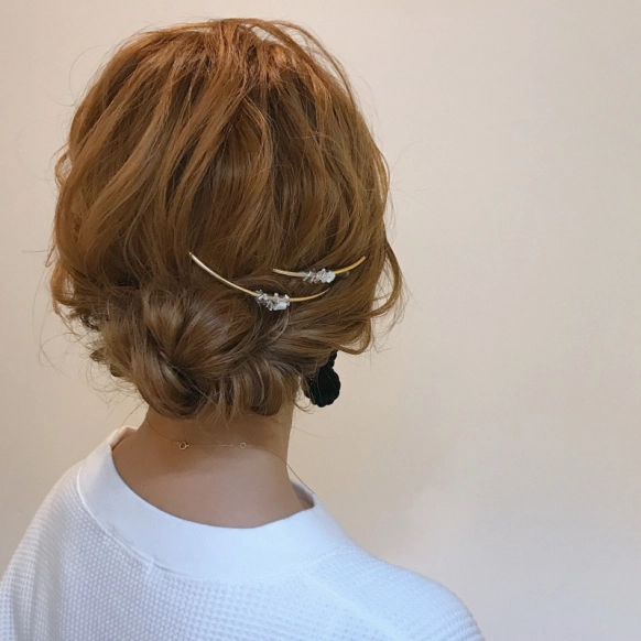 ミディアムヘアなら着物にぴったりのアップスタイルが◎!まずはコテで全体を巻き、動きをつけましょう。この下準備があれば、あとは簡単にまとめるだけでもおしゃれに決まるため、自分でもチャレンジできるはず!あえてかっちりさせすぎず、ゆるめのアップにするのがいまどきのやり方です。仕上げに着物らしい髪飾りをつけましょう。