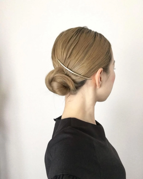 すっきりとさせたまとめ髪も着物ヘアと相性抜群です。きっちりセンター分けにして後ろでひとつに結び、毛先を分けてねじりながら巻きつけてピンでとめシニヨンに。ツヤ感が出るよう、スタイリング剤はオイルベースのものが◎!クレセントコームをアクセントにするのもいいですね。