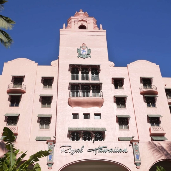 かわいらしいピンクの外観が特徴の『THE ROYAL HAWAIIAN RESORT WAIKIKI(ロイヤルハワイアンリゾートワイキキ)』のロイヤハワイアンホテルは、太平洋のピンクパレスとして有名なリゾートホテルです。宿泊者限定のプライベートビーチエリアではピンクのパラソルの下で、ワイキキビーチの景色を楽しみながらゆったりとした時間を過ごすことができます。また、『ロイヤルハワイアン』と『シェラトン・ワイキキ』の間には「ヘルモア プレイグランド」という子どもも楽しめるプール、ジャグジー、ウォータースライダーがあり、この2つのホテルの宿泊者は利用することが可能です。ワイキキの中心部に位置し、『ロイヤルハワイアンセンター』も隣接しているので、ショッピングに出かけるには好立地な場所にあります。