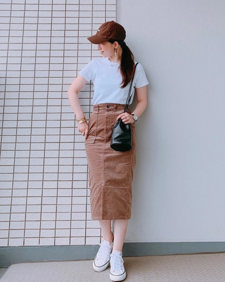 夏の定番アイテムTシャツを使ったタイトスカート×スニーカーコーデ。Tシャツとスニーカー、キャップとスカートの色を合わせて、2色コーデの完成です。シンプルで清潔感がありピクニックなどにもぴったりなコーデです。